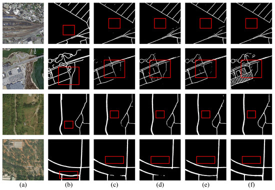 Visualization of the ablation study, where the top two rows are segmentation results for the Massachusetts Roads dataset and the bottom two rows are the segmentation results for the DeepGlobe dataset. (a) Original image. (b) Ground truth. (c) No. 1. (d) No. 2. (e) No. 3. (f) No. 4.