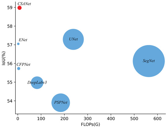 Figure 9 visually shows the relationship between the computation burden and the IoU accuracy on the Massachusetts Roads dataset. The area of a circle is proportional to the computational complexity. ENet has a small computational load due to its use of small convolution kernels throughout the process. CFPNet and CSANet greatly reduce the amount of computation by introducing depth-wise separable convolutions. Furthermore, our CSANet uses axial attention to compute the attention map. Therefore, the computation burden is reduced further. DeepLabv3 also uses depth-wise separable convolution in Xception, so it has a smaller amount of computation. SegNet has a huge computation complexity because it has a large number of convolution operations in the encoding and decoding parts.