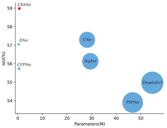 Figure 10 visually shows the relationship between the parameter size and the IoU accuracy on the Massachusetts Roads dataset. The area of each circle is proportional to its parameter amount. UNet brings more parameters due to its wide network structure (the number of channels increases exponentially during downsampling). The SegNet uses a large number of convolution operations in the encoding and decoding part, which also brings more parameters. PSPNet has a large number of parameters because it aggregates features at multiple scales. Furthermore, due to the existence of the ASPP module in DeepLabv3, the computation of multiscale, features with different receptive fields brings additional parameters. ENet uses asymmetric convolution to reduce the number of parameters and atrous convolution to expand the receptive field. CFPNet reduces the number of parameters by stacking parallel asymmetric depthwise convolutions. The CSANet also uses asymmetric convolution to reduce the parameter size. The CSANet achieves state-of-the-art performance with a comparable number of parameters to lightweight networks such as ENet and CFPNet.