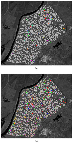 Visualization of an example of suspected mislabeled crops from the Sector BXII crop survey, with confusion between Cotton (green) and Sugar Beet (dark green) crops. (a) Superposition of Sentinel-2 RGB image of 22/04/17 and supplied crop types; (b) Sentinel-2 RGB image acquired the 22/04/17.