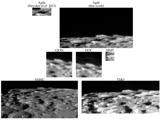 Chanover et al. [11] used a “lunagraph”, a dark slide partially obscuring the illuminated disk of the Moon both in Agile’s field of view (FOV) and outside of it toward lower latitudes, to reduce scattered light from the lunar disk. The attenuation of light in the FOV due to the lunagraph extended beyond the unilluminated portion of the CCD, as noted by Chanover et al. [11]. (Hereafter, FOV typically refers to a subset of a camera’s field of view.) The FOV used in this work was determined by visual inspection of PCA results post-coregistration to find the lowest latitude unaffected by motion of the FOV relative to the lunagraph. Our usable FOV is approximately eight times larger than the area analyzed by Strycker et al. [13] (see Figure 1). Table 1 contains further attributes at the time of acquisition for the Agile data and all data sets.