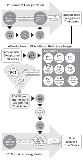 The coregistration method described in this work addresses the noise, seeing, and geometric distortion in the reference image by employing two rounds of coregistration. The flowchart in Figure 2 illustrates the process. Round one yields an intermediate coregistered time series. We then apply PCA filtering to it to produce a better reference image, which we use for the second, final coregistration.