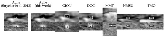 The static lunar landscape for each data set, including the Strycker et al. [13] reduction of Agile data. These are the PC1 pixel amplitudes, which show the typical quality of seeing across each time series but with greatly reduced contamination from noise and geometric distortions.