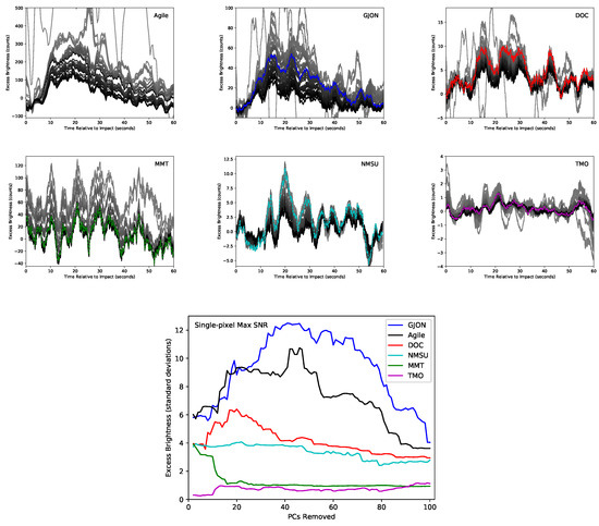 The small panels contain PCA-filtered lightcurves from CSE. These show excess counts for the first minute after impact at the maximum SNR pixel (see Figure 4) with a 2.5 s boxcar average (We assume the use of PCA-filtered data with a 2.5 s boxcar average for all subsequent figures). The lightest shade of gray is PCA filtering by removing only PC1, and shading darkens with increasingly higher PCs filtered in CSE. The line becomes black when PCs 1–100 are removed for all cameras except for TMO, for which black represents PCs 1–300 removed. The dashed line indicates the lightcurve at the level of PCA filtering chosen based on the maximum SNR shown in the lower panel. The lower panel shows the SNR achieved through CSE of PCs from each data set. We averaged the excess brightness at the maximum SNR pixel (see Figure 4) over 15 to 33 s after impact for all cameras except for NMSU, for which we narrowed the window to 17 to 23 s after a non-detection using the broader window.