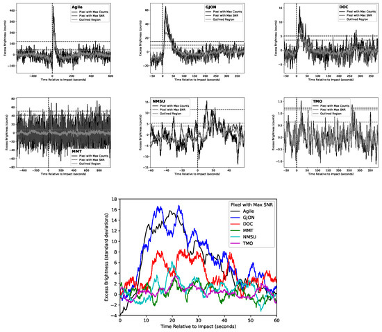 Lightcurves retrieved with the methodology of this work from the locations indicated in Figure 4. The small panels show the total duration of each observation. The horizontal dashed lines give the 3σ level for each camera. In the lower panel, the excess brightness is shown scaled by signal strength in standard deviations for the first minute after impact.