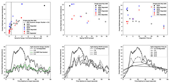 Maximum retrieved SNR over 15 to 33 s after impact from degraded data at the maximum SNR pixel (see Figure 4). From left to right, these are results for additional scattered light, worsened atmospheric seeing, and longer exposures. The bottom row shows lightcurves for selected data. The lightcurve for an MMT-like amount of scattered light does not fully characterize MMT because it does not take other factors into account (e.g., the fact that the dynamic range of MMT data was smaller than that of Agile data).
