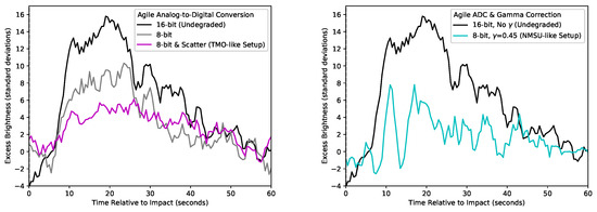 SNR retrieved for Agile data degraded with 8-bit resolution (left) and both 8-bit resolution and gamma correction (right) at the maximum SNR pixel (see Figure 4). The TMO-like setup (magenta line) shows the possibility of a visible-band plume detection with an observational setup similar to that of TMO. TMO, however, did not achieve a high SNR of the illuminated lunar landscape before the ADC process, unlike the degraded Agile data here. Thus, the magenta line ought to have a greater SNR than any plume signal in the TMO data. The cyan line in the right panel is degraded to 8-bit resolution with gamma correction of 0.45 and the dynamic range adjusted to match that of the NMSU data.