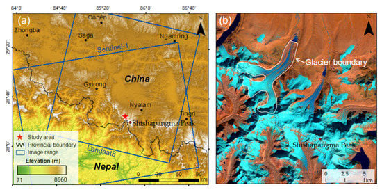 (a) Data coverage map of the experimental area and (b) false color image of the glacier with Landsat 8 OLI Data (652-band Fake Color Synthesis). In (a), the study area is located near Shishapangma Peak in Nyalam County, Tibet Autonomous Region, China, and about 16 km from the China-Nepal border. In (b), blueish colors represent glacier and snow-covered areas, and reddish colors represent bare surface and surface moraine glacier areas.