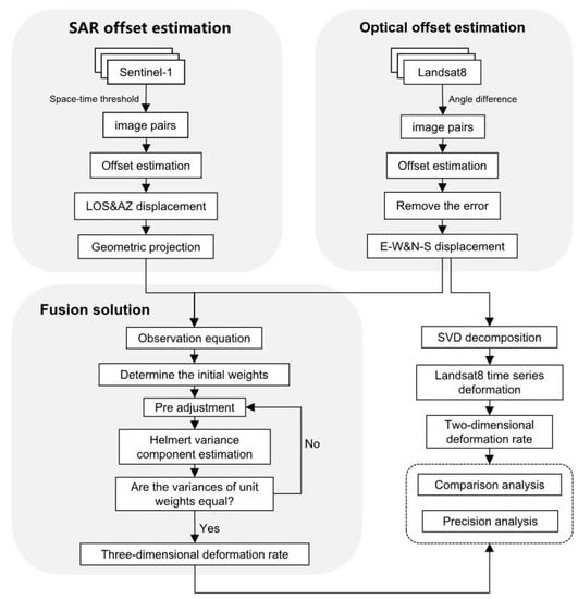 As a joint adjustment method for multi-category data, Helmert variance component estimation can usually obtain the optimal estimate of observations. First, we classified the observed values according to their different sources and determined the initial weight and pre-adjustment of each value. Then, the posterior unit weight variance of various values was calculated according to certain principles. The iterative operation of the observation quantity was performed until the errors in their unit weights were equal or the ratio of the variances of all types of unit weights is equal to 1. Some scholars have studied the fusion of InSAR and GPS observations using this method []. In this study, the posterior estimate of the stochastic model was used to estimate the SAR and optical displacements using variance component estimation. The basic principles and processes are as follows.