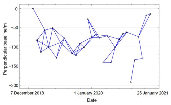 The offset tracking technology based on SAR images uses a normalized cross-correlation algorithm to obtain the offset in the range and azimuth directions. Since the calculation results will be affected by the incoherent noise of SAR images, the small baseline set pixel tracking algorithm [] is adopted in this paper. First, the optimal baseline combination was obtained by setting spatial and temporal threshold values (Figure 3). Then, the offset was estimated using the intensity-tracking algorithm, which requires less coherence. To obtain high-precision offset results, the search window size was set to 128 × 128 pixels (range × azimuth), the search step was 5 × 1 pixels (range × azimuth), and the correlation coefficient threshold was 0.2. These settings were designed to balance the offset signal and noise generated by the estimation process.