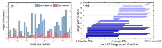 Landsat 8 image pairs and their angle difference. (a) Difference between the solar altitude angle and solar azimuth angle for each image pair. (b) Time baseline for each image pair.