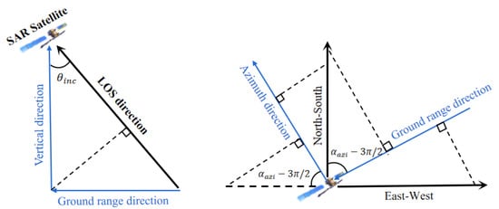 where and are the deformation in the line of sight (LOS) and the azimuth of coherence point i in the rth interference pair, respectively. are the deformation rates of point i in the east–west, north–south, and vertical directions, respectively. is the time interval of the rth interference pair. and are the projections of the LOS direction on coherence point i in the east–west, north–south, and vertical directions, respectively. , and are the projections of the azimuth direction on coherence point i in the east–west, north–south, and vertical directions, respectively. The values were calculated according to the geometric relationship of the projection (Figure 5) using the following equations: