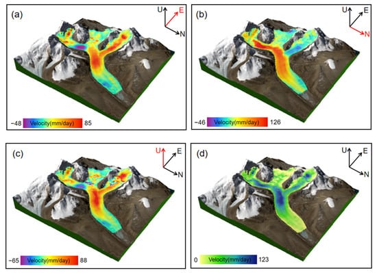 Results of the three-dimensional displacement rate of glacier surface: (a) west–east; (b) north–south; (c) vertical; (d) after the synthesis. The superimposed background is a 3D model from Landsat 8 images combined with DEM in the study area. The upper part of the glacier has reached 6588 meters, with several steep peaks. White shows the snow and glacier-covered area.