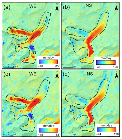 In processing with the Cosi-corr software, we adopted a two-level window search strategy to obtain more accurate results. First, we set the window size to 64 × 64 for the initial search to reduce the effect of outliers on the image matching accuracy and then set the search window size to 32 × 32 to obtain more deformation details. Then, we set the search step to four pixels and the number of iterations to two. We masked the uncorrelated noise according to the amplitude of the log-cross-correlated spectrum using a mask threshold of 0.9. The offset of the image pair was estimated based on the frequency domain cross-correlation algorithm, and the displacement in the east–west and north–south directions and signal-to-noise ratio (SNR) were obtained. The errors caused by uncorrelated noise in the north–south and east–west results were further removed by selecting pixels with an SNR greater than 0.9. The orbit error in the offset result was removed using the polynomial surface-fitting model. Owing to the marked and uniformly distributed linear signals forming strip errors along the orbit direction of the push-broom imaging satellite, the strip errors were removed from the offset results by means of mean subtraction []. Simultaneously, the final offset results were processed using non-mean filtering to smooth the influence of local noise. The optical image time-series offset results were solved using the singular value decomposition (SVD) method. The results of the time-series displacement were obtained by integrating the deformation rate with time (Figure 2).