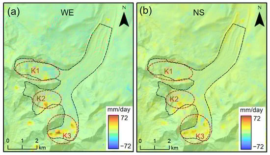 Glacial flow rate difference before and after fusion in the study area: (a) west–east difference of deformation rate; (b) north–south difference of deformation rate.