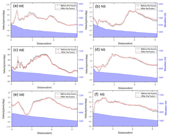Profiles of glacial flow rate before and after fusion: (a,c,e) west–east flow velocity profiles along A, B, and C (Figure 7); (b,d,f) south–north flow velocity profiles along A, B, and C.