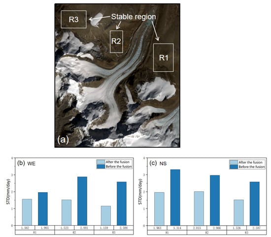 Monitoring accuracy before and after fusion: (a) stable regions R1, R2, and R3 for accuracy assessment; (b) standard deviation comparison in the west–east stable region; (c) standard deviation comparison in the north–south stable region.