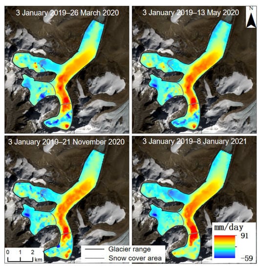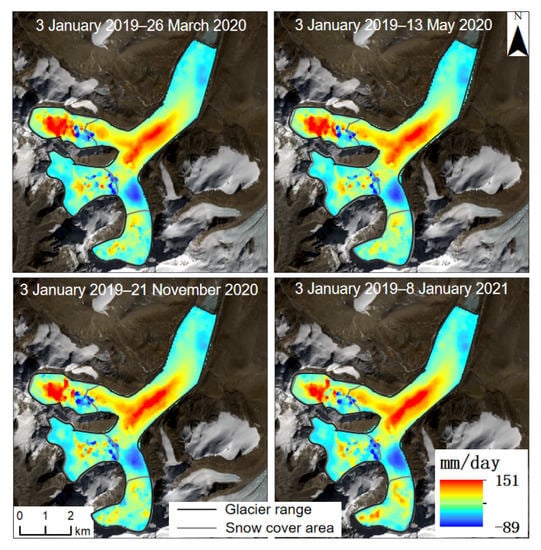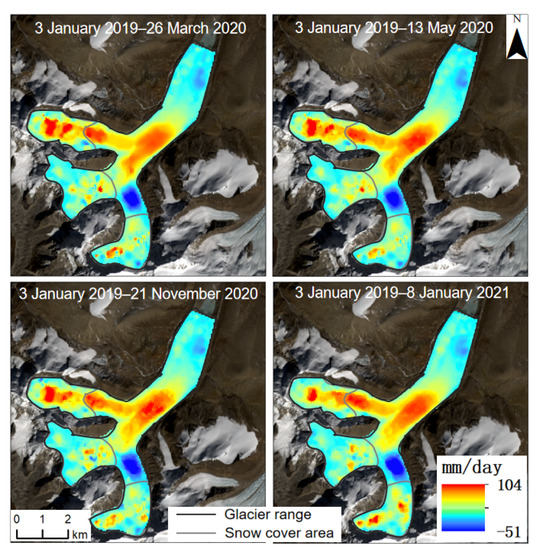 Based on variance component estimation, the displacement results of the glacier surface time series could be obtained with high accuracy. However, more SAR and optical image pairs were required to achieve higher accuracy. Because optical images are easily affected by meteorological conditions, the SAR image pairs involved in our experiment were sufficient, and the number of optical image pairs was small. Therefore, the period in which both optical and SAR image pair numbers were greater than 12 (Table 3) was selected to calculate the west–east (Figure 12), north–south (Figure 13), and vertical (Figure 14) time-series velocity of the glacier. The time-series results of the four periods were obtained, as shown in Figure 12 and Figure 14. The confluence area of the glaciers showed strong three-dimensional movement characteristics.