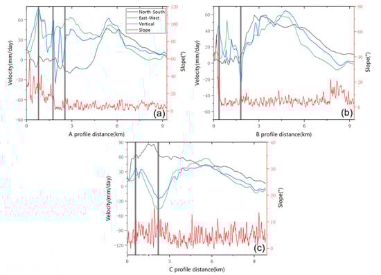 Comparison of profiles for glacier velocity and topographic profile (profiles along A, B, and C are shown in Figure 7a). (a) Deformation velocity and slope of profile A; (b) Deformation velocity and slope of profile B; (c) Deformation velocity and slope of profile C.