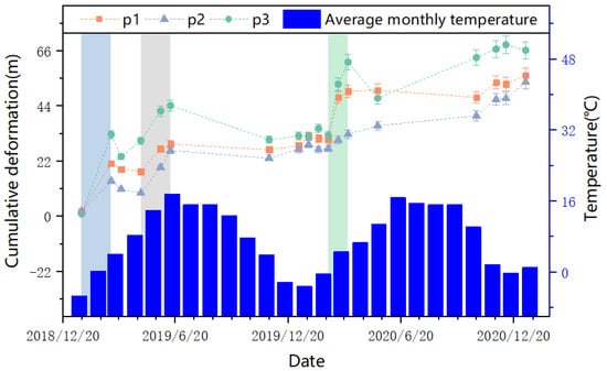 Relationship between optical horizontal time-series deformation and temperature in the glacial study area (error bar is calculated as 5% of the data). P1, P2, and P3 are shown in Figure 7c. The average monthly temperature data are from the Xigaze weather station on the world weather website (https://rp5.ru/ (accessed on 26 July 2022)).