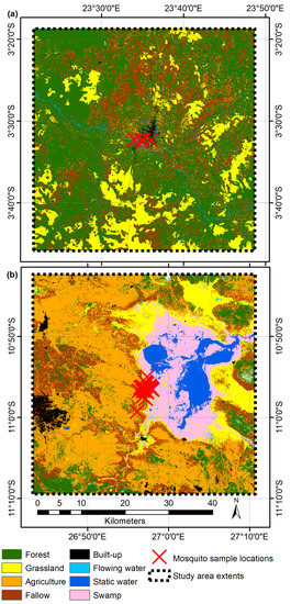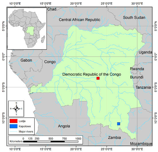 This project focused on two 50 km × 50 km urban areas and their surroundings in the DRC: the medium-sized town of Lodja (population approx. 80,000) (latitude: −3.524661°, longitude: 23.596669°) and a smaller settlement, Kapolowe (latitude: −10.942157°, longitude: 26.952115°) (Figure 1). Both are meso-endemic for malaria, with parasite prevalence between 6 and 30% [46] and with high Plasmodium sporozoite rates for An. gambiae s.l. (Lodja 2.9% (9/307), Kapolowe 6.3% (8/127)) and An. funestus (Lodja 0% (0/24), Kapolowe 8% (4/50)) [47].