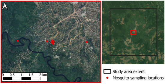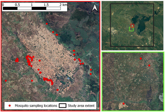 Conventional studies of mosquitos conducted over an extended period of time are limited in geographical scope due to the logistical constraints and labour-intensiveness of data collection, typically involving trap deployment to catch adult mosquitoes [25] or the collection of immature larval stages by sampling water bodies [26] over several years, incorporating successive rainy and dry seasons. Broader malaria risk mapping has been performed using data-driven modelling [13]; however, this often offers a very specific characterisation of local scale contexts at high resolutions or very general descriptions of large-scale phenomena at low resolutions. Both approaches limit the ability to describe disease transmission mechanisms precisely [27] and suffer from limited data availability in remote areas. Ecological niche modelling (ENM) has been extensively used in the study of the distribution of a variety of infectious diseases, their vectors, and their hosts to identify the geographic distribution of suitable habitats for the transmission of diseases. Although studies such as [28] used ENM to produce static spatial maps of the risk for mosquito species at a relatively coarse 1 km resolution, these do not typically reflect how this risk may change seasonally [29]. Satellite remote sensing offers a solution, providing frequent, multi-resolution climate and land surface data, enabling the identification and monitoring of environmental risk factors of vector-borne diseases [30,31,32,33,34] over large areas [35] and at far higher spatial resolutions (up to 10 m for cost-free Sentinel-2 imagery) and describing how these change seasonally. Remote sensing has found increasing applications in epidemiology, including malarial studies, over the past 40 years. It is principally used to provide information on environmental variables that determine the distributions of infectious disease either directly or through their influence on vector, pathogen, or host habitats [20,36]. Within a malaria context, remote sensing has been applied to identify specific landscape characteristics linked to malaria and mosquito distributions [32,37].