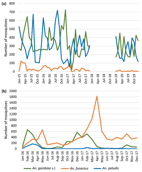 Monthly Anopheles collection data using human landing catches (HLC) from (a) Lodja in 2015–2017 and 2019 and (b) Kapolowe in 2016–2017. Monthly mosquito numbers are the sum of all mosquitoes collected at the eight HLC sampling locations in that given month.