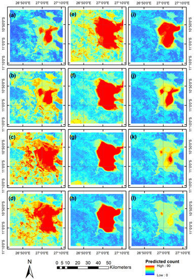 Predicted counts of An. funestus for the 50 km x 50 km Kapolowe study area extent for (a) January 2016; (b) February 2016; (c) March 2016; (d) April 2016; (e) May 2016; (f) June 2016; (g) July 2016, (h) August 2016; (i) September 2016; (j) October 2016; (k) November 2016; and (l) December 2016.
