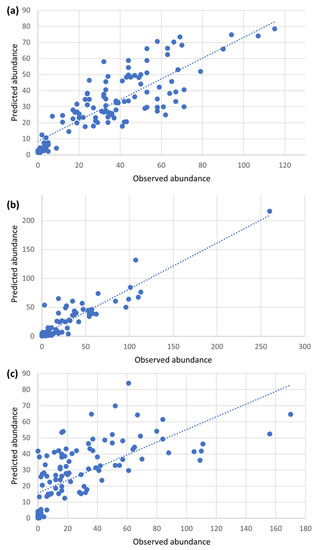 Scatter plots of predicted versus observed mosquito counts for (a) An. gambiae s.l., (b) An. funestus, and (c) An. paludis.