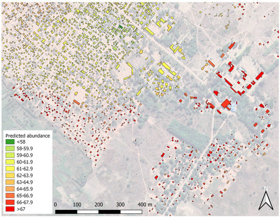 When peaks of predicted abundance occur in areas of low human population densities, malaria risk may remain low. However, if peaks of mosquito abundance coincide with areas of higher population presence, this can result in increased malaria risk in these communities. To assess the implications for the local community, predicted abundances were extracted for each building, for each species, and for each month. Assessing abundances on a building-by-building basis is valuable, as biting behaviour occurs mostly at night when people are in their homes. Therefore, identifying patterns of risk for individual residences can aid specifically targeting these locations with preventive measures. Figure 9 shows, for a localised area of Kapolowe in February 2017, how An. gambiae s.l. abundance varied considerably over relatively short distances. Buildings on the edge of Kapolowe, which are closer to woodland and arable land cover, exhibited higher abundances than those of more central buildings.