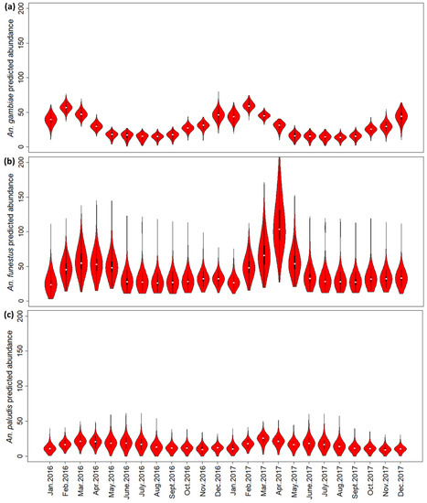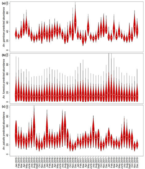 RF-predicted abundance surfaces were generated for each month and for each mosquito species at the two study sites (January 2015–December 2017 and January 2019–December 2019 for Lodja and January 2016–December 2017 for Kapolowe). The predicted surfaces for all months for all species are presented in Supplementary Information (Figures S3–S20). Specific examples showing the spatial variability in predicted abundance for the three species in Lodja in November 2015 are presented in Figure 6, and Figure 7 shows the seasonal variability in predicted abundances over a year, which here is for An. funestus in Kapolowe in 2016.