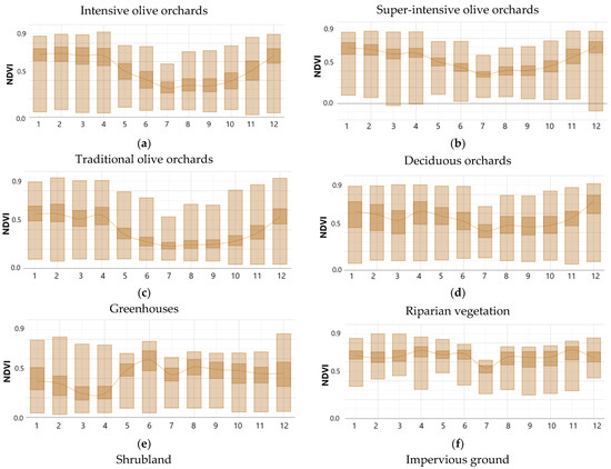 From Figure 7, we can see that deciduous orchards (Figure 7d) had very similar temporal profiles to evergreen olive orchards (Figure 7a,b). The visual examination of multi-temporal VHR Google imagery showed that this was often caused by intercropping practices or natural grass growth during the winter months, which biased the reflectance profile (see Figure 8). Riparian vegetation also showed high NDVI values throughout the year (Figure 7f).