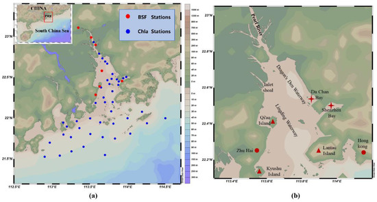 (a) Spatial distribution of sampling sites in the study [36]. The red dots are BSF sites, and the blue dots are chlorophyll sites. They are evenly distributed in the Pearl River Estuary area; (b) Place names in the PRE region appearing in this article.