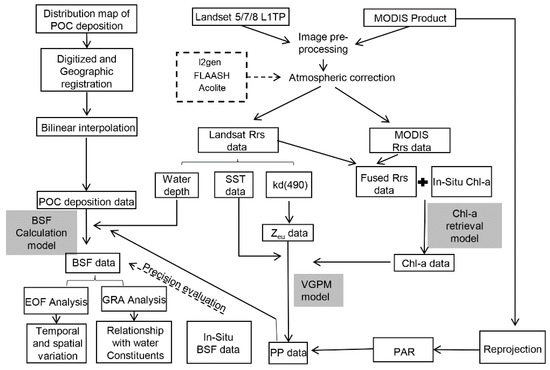 We preprocessed the downloaded Landsat image and then performed atmospheric correction. After that, in the SeaWiFS data analysis system (SeaDAS) software, the research area of MODIS PAR products was cut. Used the PAR data for bilinear interpolation to achieve the uniform spatial resolution as the Landsat image. To obtain sea surface temperature (SST), we applied the Google Earth Engine (Gee) platform. The Environment for Visualizing Images (ENVI) software was used to calculate water depth data, euphotic depth (Zeu), and chlorophyll-a concentration. Eventually, we used interface description language (IDL) and MATLAB software to write programs based on the chosen model and calculate the primary productivity and BSF in the PRE.