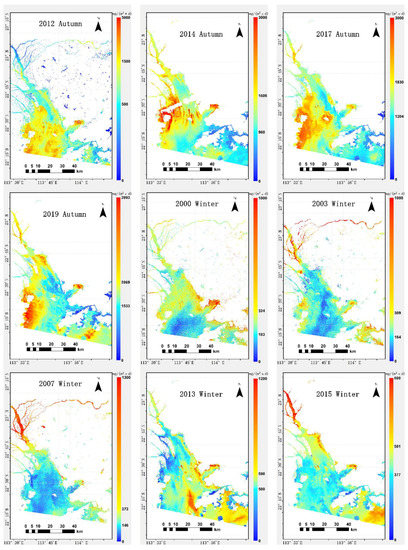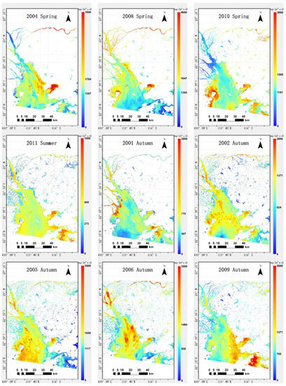 There are a lot of clouds in the PRE area for a long time, especially in spring and summer. As a result, very few Landsat images were available for remote sensing retrieval in the PRE each year. Therefore, the most suitable image, which has the least cloud cover over water in the PRE, is frequently acquired in autumn and winter. Figure 3 depicts the calculated BSF distribution of the PRE over 21 years. Clouds obscured the remote sensing images chosen in 2014, resulting in missing values in some areas.