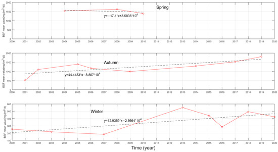 The variation trend of the Pearl River Estuary’s average BSF value in spring, autumn, and winter from 2000 to 2020. Because there is only one distribution result in summer, no change trend analysis is performed. Based on the situation in winter and autumn, with more distribution results, the BSF has shown an overall increasing trend over the past 20 years.