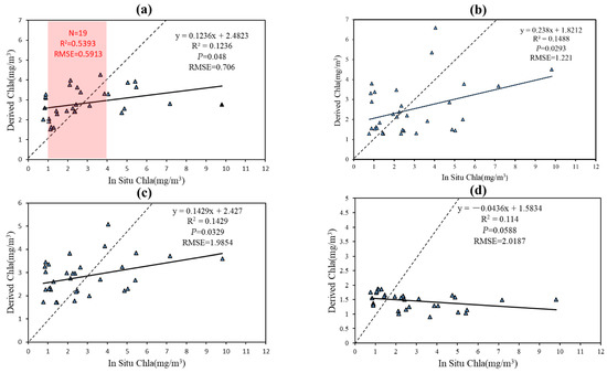 Relationship between the value of in situ Chla and Chla estimated by the model (N = 32). The solid line is the fitted trend line, and the dashed line is the y = x line. (a) The single-band model used in this paper. The points in the red area are when the in situ Chla data is 1~4 mg/m3. The fitting effect is better, with the R2 reaching 0.5393; (b) The RTA20 model; (c) The SR model; (d) The SSMI model.