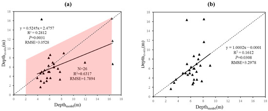 Correlation between actual water depth and model retrieved water depth (N = 29). The solid line is the fitted trend line, and the dashed line is the y = x line. (a) The exponential model used in this paper. The points in the red area are when the retrieval water depth data is within 16.5 m, except an abnormal point. The fitting effect is better, with the R2 reaching 0.6317; (b) the polynomial model.