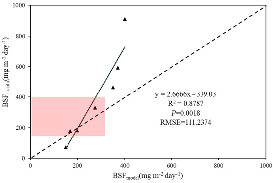 According to Yang’s discussion, this model is appropriate for calculating BSF in the estuary. Moreover, we overcome the limitations of this method to a certain extent. Yang considered only three main parameters, and the POC sinking flux was obtained based on an average estimate of the whole region. In our study, POC sedimentation data were calculated by inputting various parameters. As a result, we considered the effects of other variables, such as nutrients, water flow and algal concentration. The primary producers are primarily diatoms in the PRE [21,23]. Therefore, the sedimentation flux estimated from primary productivity is very close to the BSF. In conclusion, the model is suitable for this study.