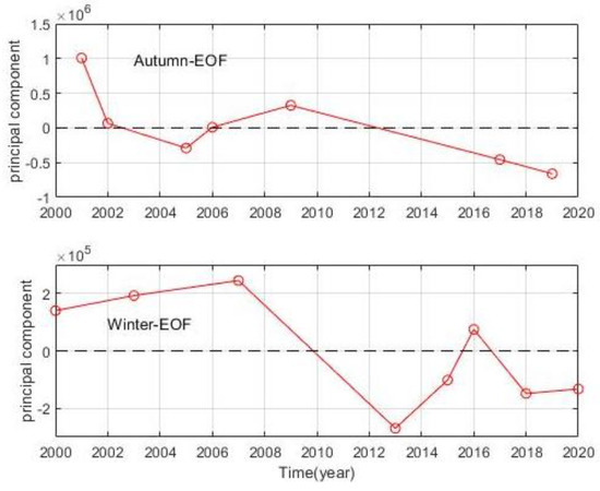 In the springs of 2004, 2008, and 2010, the average value of BSF fluctuated around 1500 mg/(m2 × d), which shows a trend of first increasing and then decreasing. During the three-year spring period, the general trend slightly declined, and the slope of the trend line reaches 17 mg/(m2 × d) per year. Over the previous 21 years, the PRE’s average BSF value in autumn ranged from 500 to 2000 mg/(m2 × d), and it was between 100 and 600 mg/(m2 × d) in winter. Examining the change in BSF over the years, it generally showed an upward trend from 2000 to 2020, but fluctuated in some years. According to the growing trend, the BSF value in autumn is greater than that in winter, and the slope of the trend line reaches 44 mg/(m2 × d) per year. In the winter, it is only 12 mg/(m2 × d) per year. We also discovered the BSF in the PRE decreased from 2013 to 2016 in winter. This shows that the interannual variation of BSF in the PRE is increasing overall, but oscillating.