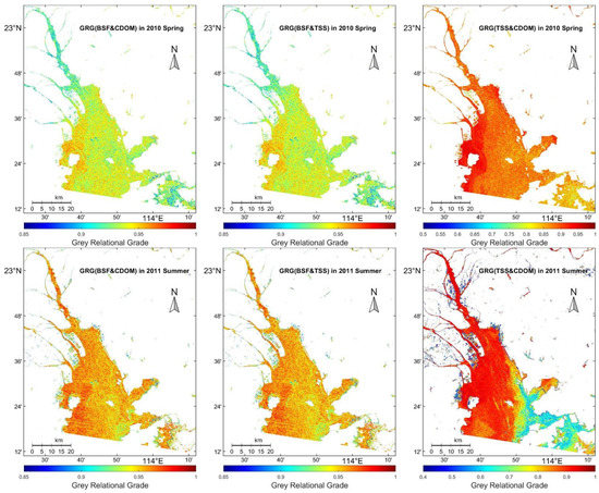 The accuracy of the BSF results was evaluated using the Pearson Correlation Analysis with Pearson’s correlation coefficient (R2) and significant value (P). We used the empirical orthogonal function analysis (EOF) method to analyze the spatiotemporal changes of BSF. The main water quality factors affecting BSF were determined using grey relational analysis (GRA). The corresponding pixel values of the two images are searched through a 7 × 7 window in GRA, with a comparison sequence established to calculate the grey relational grade (GRG). We assigned the window’s GRG value to the central pixel, and the window was cycled through to obtain the entire GRG distribution image [43,44]. Figure 2 shows the technical roadmap.
