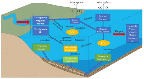 To estimate the number of particles transferred to the bottom of the sediment, the sedimentation flux value is the main quantitative parameter [3]. The significance of studying biosiliceous sedimentation flux (BSF) has three aspects. Firstly, BSF is critical for understanding the carbon cycle [4]. Carbon in sediments is a vital form of “blue carbon” storage, and offshore biodeposition plays an essential role in the carbon cycle [5]. At the same time, the sedimentation processes of surface biological particles transported to the seabed have a significant effect on the biogeochemical cycle of the marine ecosystem [6]. Therefore, estimating BSF is beneficial when investigating carbon sink potential. Secondly, in estuarine areas, sediment has a decisive influence on geomorphic stability [2]. As one of the primary sources of silt, biological siliceous deposits have a high research value in terms of estuarine delta stability, and they can explain and predict trends in coastline changes. BSF is also one of the major factors influencing island changes [7]. Finally, estuarine sediments have significant implications for the long-term management of estuaries [8], such as coastal project planning and maintaining port passages [9]. Furthermore, the study of BSF can guide the implementation of dredging and land reclamation work with economic benefits.