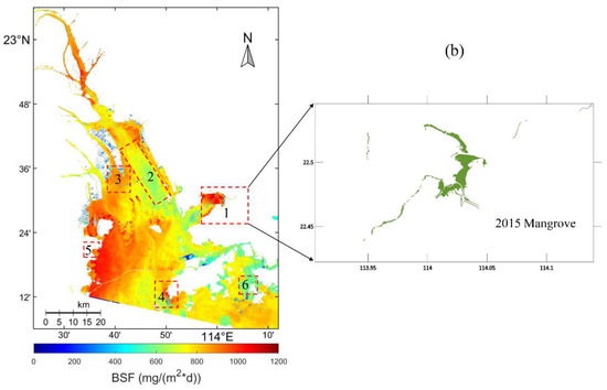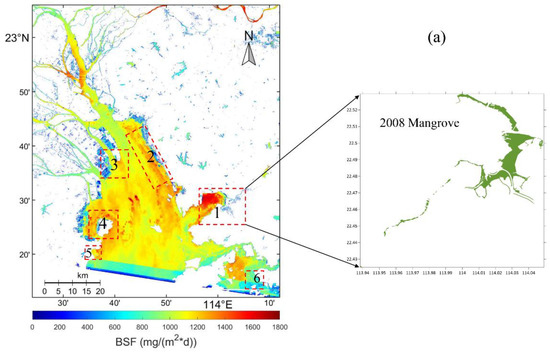 The distribution results showed that the BSF is not a simple change trend along the coast to open water. There was no absolute difference in the magnitude of the BSF values on the west and east coasts, but the average values on coasts differed at various times. The changes in BSF values were spatially related to islands, waterways and bays, and shoals. Shenzhen Bay’s BSF value was 500–1000 mg/(m2 × d) higher than the surrounding waters almost every year. The BSF value of the Dragon’s Den Waterway (DDW) was usually lower than that of the surrounding waters. In autumn, the BSF value in the vicinity of the inlet shoal was significantly higher than in the surrounding waters. Except in winter, the BSF value around Qi’ao Island was generally higher than the surrounding waters.