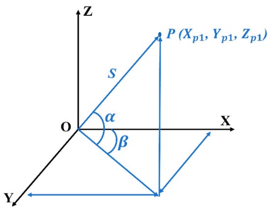 As shown in Figure 1, 3D laser scanning works based on Light Detection and Ranging (LiDAR) technology by placing a 3D laser scanner on the construction site. The scanner is always placed at multiple points around the target building for performing multiple scans from different directions. A laser scan beam rotates around its vertical and horizontal axis and reflects pulses using sensors to record the position based on reflection time from the laser to the surface of the scanned object and then back to the laser. Depending on this procedure, the point data collection with locations and distance measurement is performed automatically, so as to further establish a complete, continuous, and panoramic “point cloud” for partial or entire spatial information of the building. The 3D laser scanning uses a built-in spherical coordinate system inside the laser scanner along with the laser ranging method to achieve measurement goals as illustrated in Figure 2. It generally has two mutually perpendicular axes, around which the laser-ranging beam rotates and measures. The intersection of the rotation axes is the origin of the internal coordinate system, the horizontal rotation axis of the ground is the Y-axis while the X-axis is perpendicular to the Y-axis in the horizontal plane, and the Z-axis is perpendicular to the horizontal scanning plane to form a right-hand right angle. For example, considering an individual spatial point as shown in Figure 2, the distance between point and the built-in coordinate origin point can be easily captured by one scan. Then, the location of point in the built-in laser scanner coordinate system that expressed by (, , ) can thus be obtained according to Equation (1), based on which the absolute location of point in the geodetic coordinate system expressed by (, , ) is able to be accordingly calculated by a coordinate transformation.