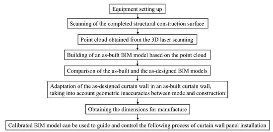 This study mainly focuses on the application of 3D laser scanning technology in the curtain wall design and installation field. Due to the irregularity and complexity of special-shaped curtain walls with curved surfaces, it is requiring high precision position and dimension information for developed design and on-site installation of curtain wall keel and panel components. Nevertheless, it is rather difficult to perform an accurate locating for the curtain wall connection points, dimension measuring for the supporting steel keels, and panel assembly and installation for the special-shaped curtain walls using the conventional manual approach. To overcome this problem, the 3D laser scanning technology is considered a suitable substitution for the traditional method for performing the data collection in an efficient and accurate manner, as well as supporting further installation and construction. It can capture and record the real-time condition of on-site construction including but not limited to locations of the completed structural construction surface (the foundation of the curtain wall keels), the completed construction surface of curtain wall keels (the foundation of the curtain wall panels), and systematically restore them with high precision in a 3D BIM model. In this model, the detailed size of each component in the curtain wall can be conveniently examined, which can be handed over to the curtain wall panel manufacturer to calibrate and revise the originally designed dimension of each panel, furthermore, the on-site assembly and installation can be as well instructed and assisted in a visualization way. Thus, it can be known that the application of 3D laser scanning technology in curtain wall construction can greatly improve work efficiency, reduce the impact of engineering construction errors on design, and avoid unnecessary material waste. The detailed procedures based on the 3D laser scanning technology along with the BIM concept are given as follows and shown in Figure 3.