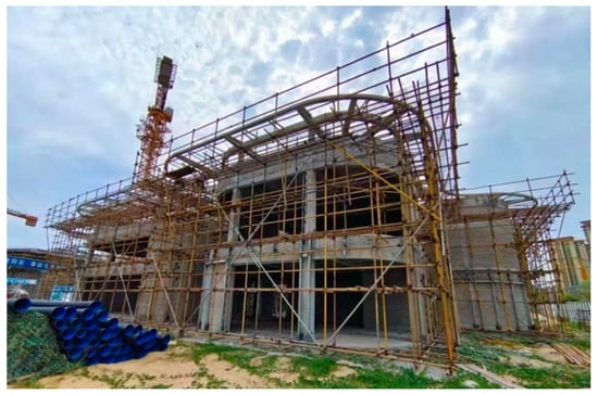 A kindergarten construction project located in Blue Harbor, Xincun Town, Lingshui Li Autonomous County, Hainan Province, China, was selected in this work to present the application of 3D laser scanning technology in the curtain wall design and installation. It was designed and constructed in two-story steel structural form covering a gross floor area of 1537.19 square meters with a total height of 9.4 m. The overall view of the project is presented in Figure 4. The 3D laser scanning work was conducted when the project was at the end of structural construction, but prior to the building facade decoration. The 3D laser scanning aimed to collect a “point cloud” dataset to calibrate the location and measurement information of both curtain wall keel and panels, so as to update a developed design and revise the curtain wall panel material order and production, accordingly. Thus, by presenting the detailed procedures, experience, and findings obtained from this field case, the practical solution of applying 3D laser scanning technology integrated with the BIM concept was indeed demonstrated to improve the accuracy and efficiency of the curtain wall design and installation progress. More details are given below.