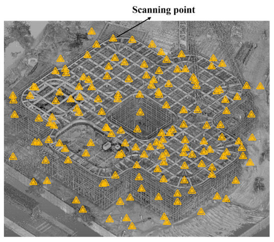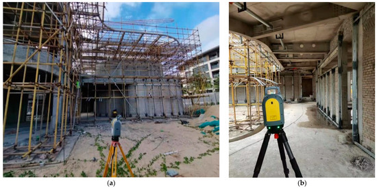 3D laser scanning combined with BIM technology has been gradually developed and promoted in the building construction industry for collecting spatial information and performing measurement tasks in lots of countries, such as the United States, the United Kingdom, Singapore, Australia, and other countries in the recent decades [18]. It can scan from multiple directions inside and outside the target buildings by adjusting the scanner laser beam and recording 3D points with information not only including the X, Y, Z coordinates but also color, illumination, and so on. The large collection of spatial points termed a “point cloud” is a set of spatial data representing the real shape of the scanned target for further 2D drawing or 3D model creation. In the models established based on the “point cloud”, locations and relative spatial relationships between different objectives, as well as the characteristics depiction of structural features can be easily obtained and displayed from the distance between spatial points. In addition, the “point cloud” can be post-processed for establishing a comprehensive data platform for increasing productivity, efficiency, and accuracy of a variety of fieldwork on building construction.