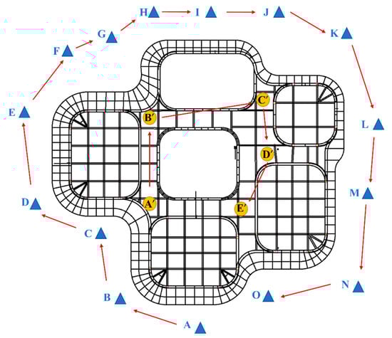 The entire process began with the 3D laser scanner set up from the outside surface of the building to the inside space of the building. With a comprehensive evaluation of factors that influence the scanning strategy, such as environmental effects (illumination, weather, etc.), the movement of construction personnel, and so on, the number of necessary scans, scanning distance to the scanned target, and scanner positions for each scan had been carefully considered first of all. Thus, a total of 15 scans were determined for the outer surface while more than 50 scans were acquired for the inside space to provide complete coverage of the entire building. After 2 days of continuous scanning, the quantity and quality of the data gathered by the scanners ensure the feasibility of further data analysis and model reconstruction without additional field rework. Based on these considerations, a scanning route beginning from the façade of the target building to the inner space given in the floor plan as shown in Figure 6 was designed. In this scanning route, (i) the scanner was placed at a certain point representing the start point (Point A in Figure 6) in front of the to-be-scanned building for the entire scanning task, (ii) moved the scanner clockwise against the building (Point A-B-C-D-E-F-G-H-I-J-K-L-M-N-O in Figure 6) for performing all designed scans of the outer surface, (iii) moved the scanner to the inside space and placed on the beginning point of the interior scanning (Point A′ in Figure 6), and consequently, (iv) moved the scanner clockwise inside the building following the route of A′-B′-C′-D′-E′ in Figure 6 (totally more than 50 scans performed as given by the yellow triangles as shown in Figure 7). Following this pre-designed scanning plan, the scanner was appropriately arranged at several locations from multiple directions to gather a huge amount of spatial data including locations and measurements for establishing a “point cloud” for the following developed design and on-site installation of the curtain wall system.