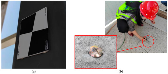 Before the scanning, a control network should be established first by scanning and adjusting multiple target boards with black and white colors as shown in Figure 8a to mark the entire ground according to the coordinate system and the scanning plan. The deployment of the control network mainly considered the visibility between each adjacent control point to ensure the entire target building could be covered, and point cloud splicing which is an important role in subsequent processing. Further, based on the deployed control network, scanning sites could thus be set up accurately. The scanning sites should be determined not only for deploying scanners to ensure the required objects of the building can be completely scanned but also can conveniently perform point data registration and coordinate transformation by connecting with the control network. It needs to note that once the points in the control network have been determined, they cannot be removed or changed through the entire progress of the scanning because the structural construction axes and the scanner axes have been adjusted and determined by measuring and recording the relative distance and spatial relationship against the control points to calibrate the on-site existing axes. If the points in the control network change, the determined axes have to be adjusted accordingly, which leads to the previous measurement and locating results being invalid. Based on these considerations, the locations of the control network were marked by multiple metal spikes fixed on the ground as shown in Figure 8b. Depending on the control network with accurate coordinate positions (geographical coordinates and plane coordinates) or elevations, the coordinates or elevations of the pre-planned scanning sites can be conveniently obtained and calculated for data registration and so on. By placing scanners on these scanning sites and performing scans, massive point cloud data were successfully captured from multiple viewing angles and positions in a faster and more exact manner. Next, a successful alignment and composition of point data slices from each scan can be achieved based on the fixed control network and the spatial locations of scanning sites. Through this data acquisition and processing, a complete point cloud dataset was thus formed.
