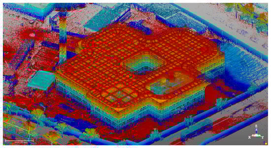 On the basis of the control network, 3D laser scanning of the visible finished layer for both the outer surface and interior space of the entire building on each scanning site was consequently performed. It should be noted that the intersections of adjacent items and components, regions that have numerous hidden corners, or fixed obstacles of the interior space on the finishing surface of the structural construction need to be particularly paid attention to. The unprocessed point cloud obtained from the entire scanning work is presented in Figure 9. It can be seen that not only the target building itself but also the scaffolds, pipe system, adjacent buildings, surrounding environment, ground landscape, etc. were captured and recorded. The existence of these additional data in the raw point cloud dataset not related to the target building provided nothing meaningful information but might inversely lead to time-consuming data processing. Thus, it is necessary to adjust the raw point cloud dataset into a more suitable pattern for the following procedures.
